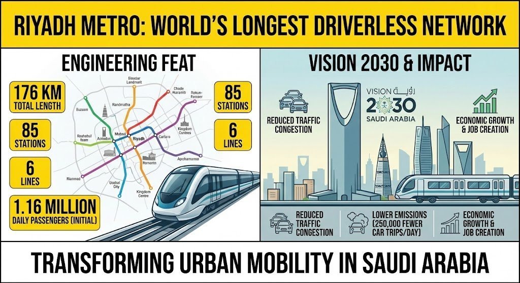 Riyadh Metro officially opens as the world’s longest driverless network (176km). Learn about its Vision 2030 goals, capacity, and impact on Saudi Arabia’s transit.