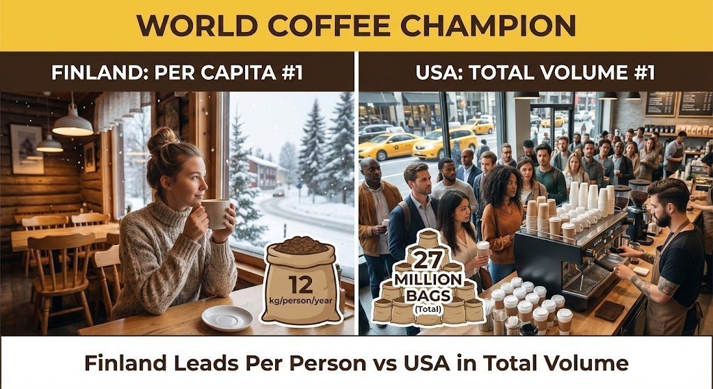 Who drinks the most coffee in the world? 2025 data shows Finland leads per person (12kg/year) while the USA leads in total volume. Discover the top 10 rankings.