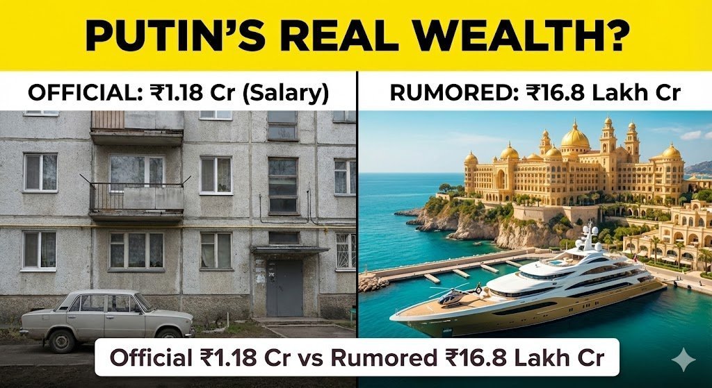 What is Vladimir Putin’s net worth in Indian Rupees? Compare his official ₹1.18 crore salary against the estimated ₹16.8 lakh crore fortune, including hidden palaces and yachts.