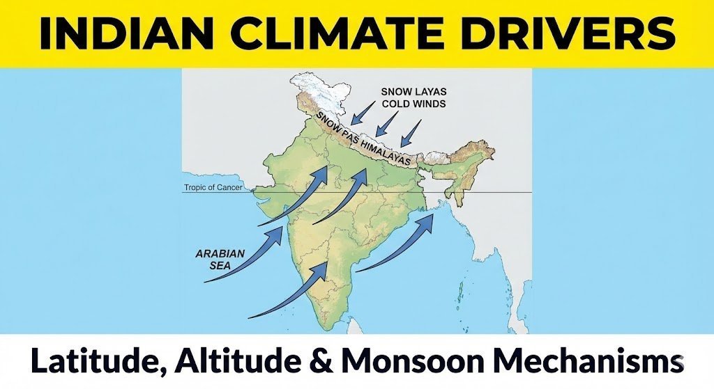 A news feature explaining the major controls affecting India’s climate: Latitude, Altitude, Himalayas (Relief), Pressure & Winds, Distance from Sea, and Jet Streams.