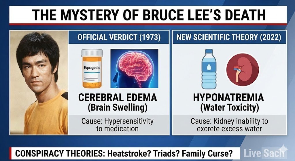 How did Bruce Lee die? Explore the official cause (cerebral edema), the 2022 kidney study suggesting water toxicity, and the timeline of his final day in 1973.
